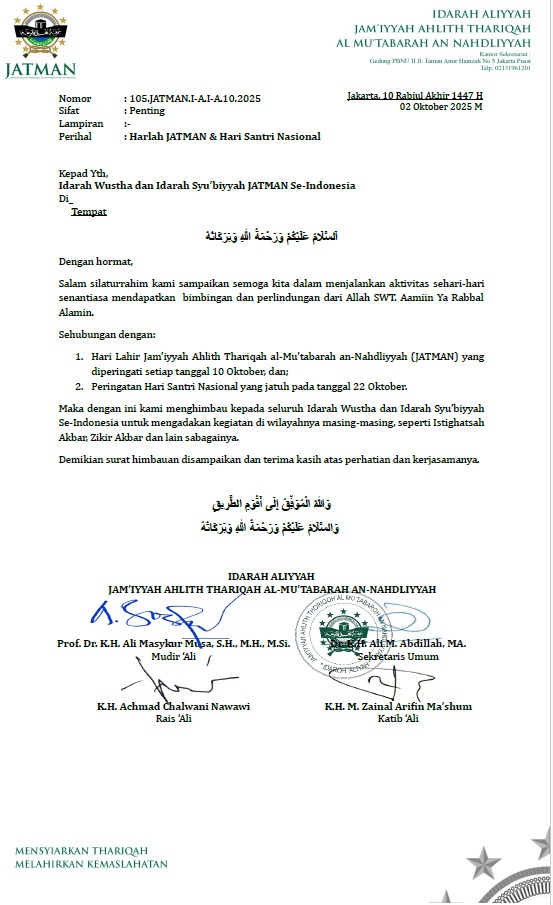 Jakarta.Maunanusantara.com- Idarah Aliyyah Jam’iyyah Ahlith Thariqah Al-Mu’tabarah An-Nahdliyyah (JATMAN) mengeluarkan surat himbauan dalam rangka menyambut peringatan Hari Lahir JATMAN yang Ke-68 Tahun, Kamis, (2/10/2025).